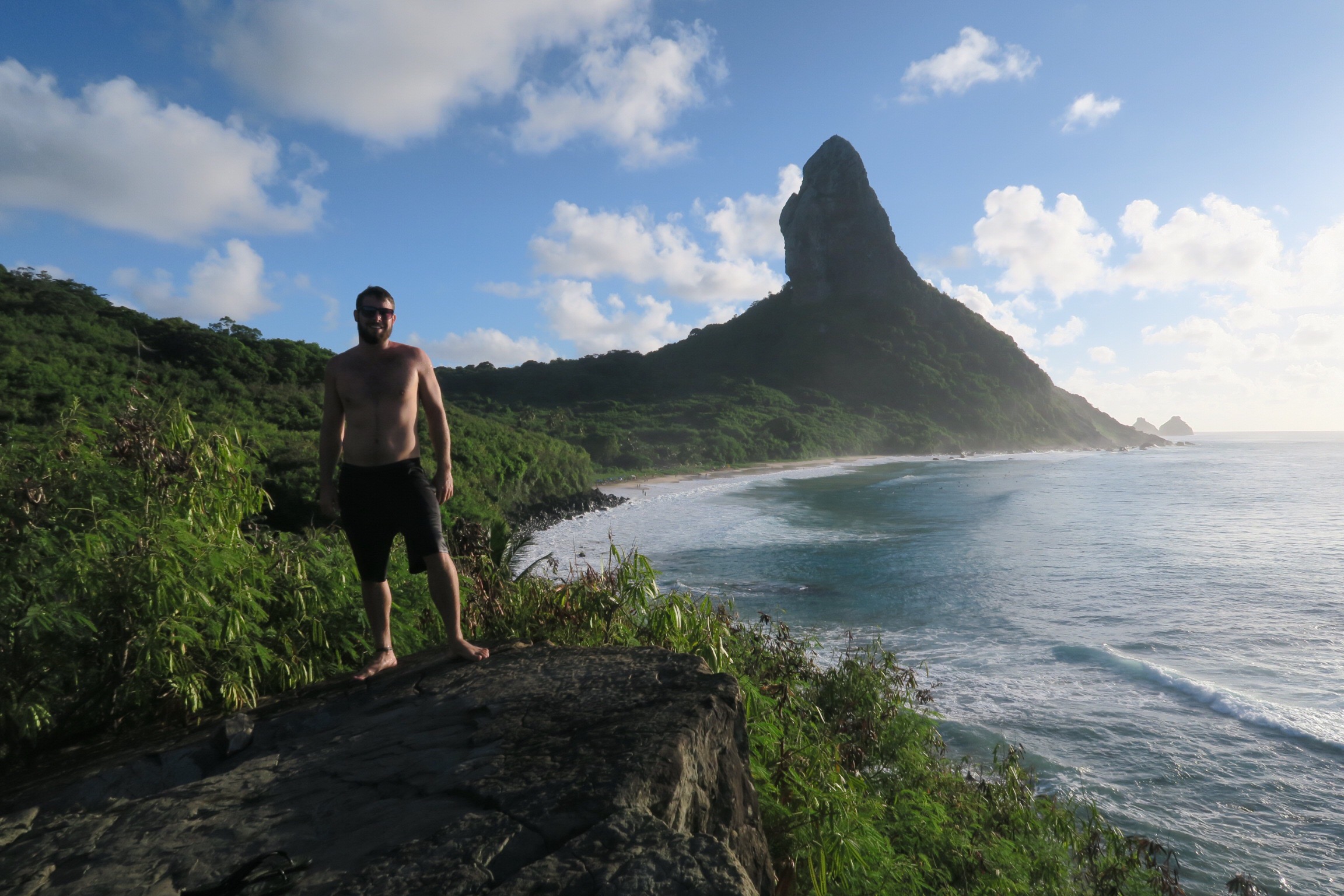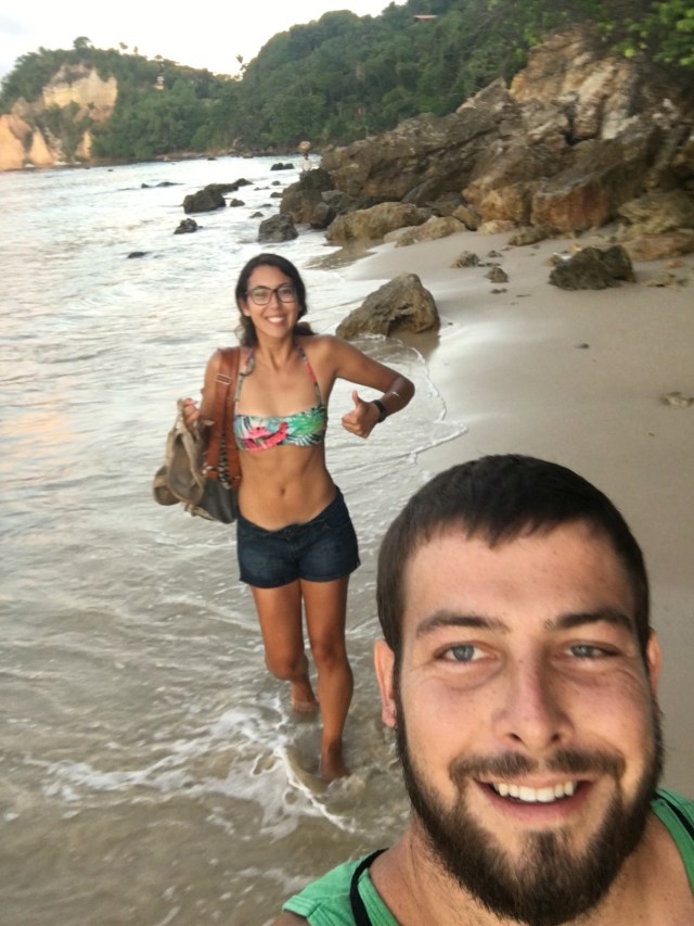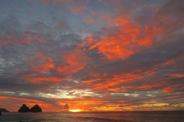 The next morning we attempted to hike to beach on the southeast side of the island but the gate was locked. This beach is highly protected and we needed to have booked a tour of some sort to visit. Instead we returned to the rough waves beach. I went for a swim and was suddenly 200 yards from shore. I got worried and swam back through the rough waves and was exhausted but relieved to be back on shore. We walked on to another nearby beach with a half mile of beautiful sand and good waves for surfing. We spent some time relaxing and swimming here but soon returned to our bungalow to check out and move to a new place. Our new place was a very hot and sweaty mile hike away but we were greeted with incredible hospitality and some great information. After a shower and clothes that weren’t soaked with sweat (the island is only 4 degrees south of the equator and quite humid) we took a taxi to the western side of the island. Here we found beautiful beaches next to the iconic “two brothers” rock islands just off the coast. We hiked to the neighboring bay which had some natural pools that were unswimmable do to the tide. We hiked a long hot way to sancho beach, which is considered by many to be the most beautiful beach in the world, or at least Brazil. We loved it. After a short hike and descending around 100 feet of ladders, we reached the beach and found some shade under a tree. We went snorkeling along the rocky edge and saw countless fish of all shapes, sizes, patterns, and colors, as well as sea turtles and sting rays. It started raining but we were thankful for a break from the sun. It was a wonderful time and we swam here for several hours playing in the waves and snorkeling. We returned to the top and took pictures as the sun set. We were lucky to meet a nice couple who shared their taxi with us just as we left, saving us a very long journey home by foot and bus. We decided to eat out for dinner because we had been successful in avoiding the high restaurant costs throughout the week. We had some delicious fish moqueca, which is essentially a stew of fish, onions, peppers and tomatoes, with a tomato, lime, and coconut milk broth, served in a piping hot bowl (sorta like fajitas). It was delicious and dinner cost less than $50. We instantly fell asleep upon returning to our room.