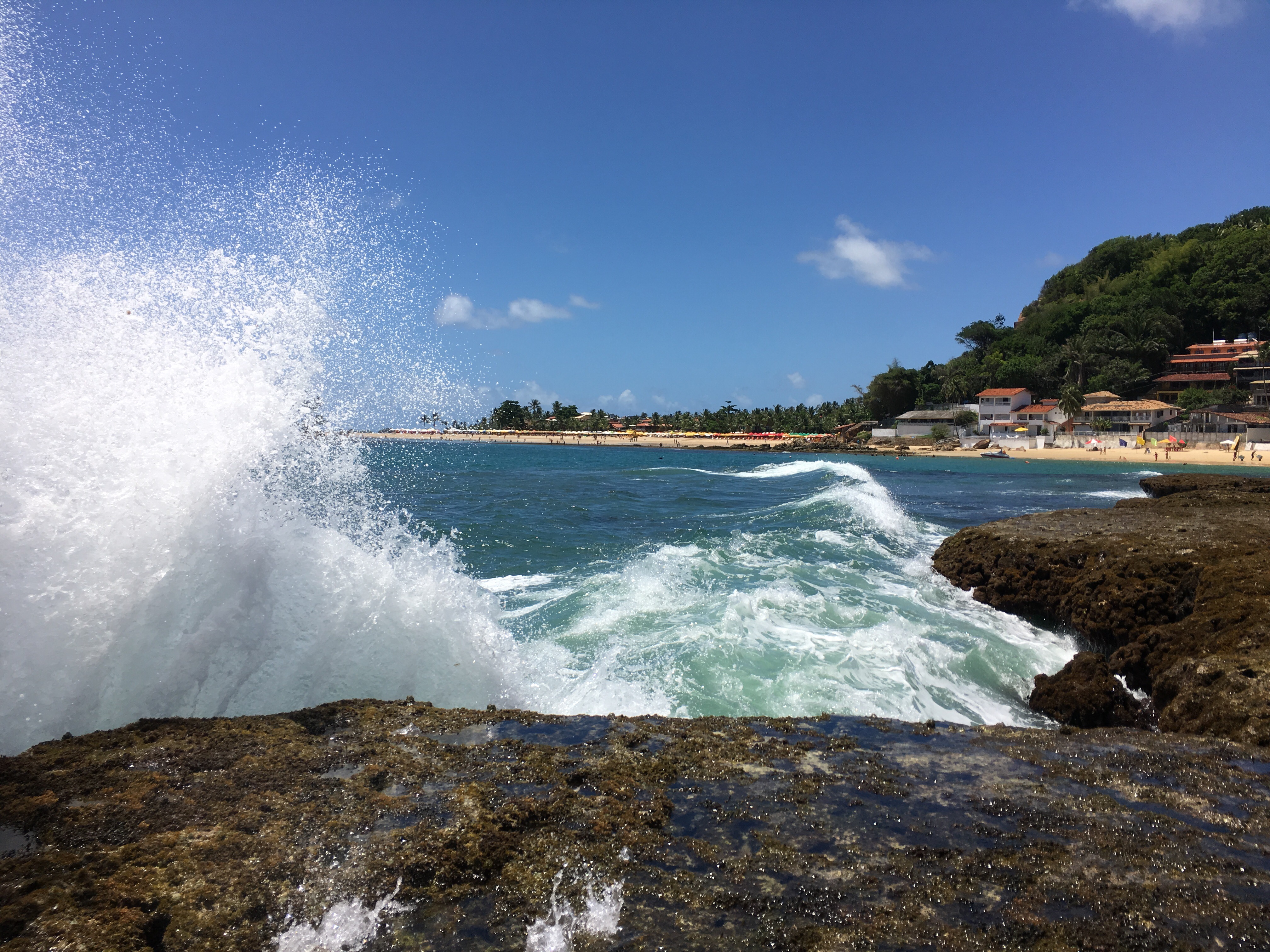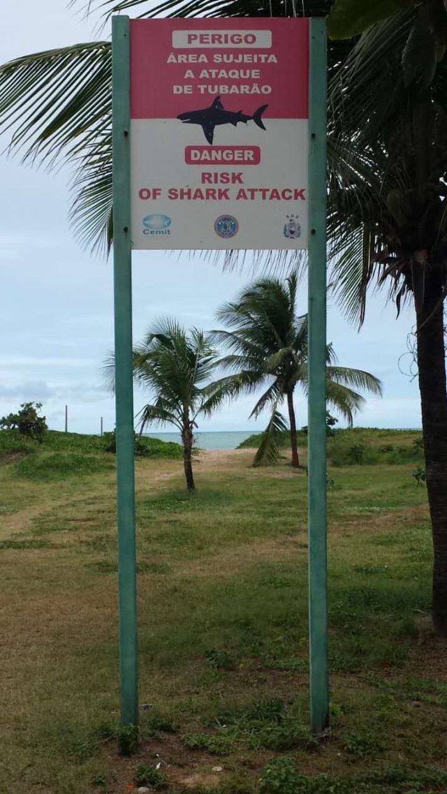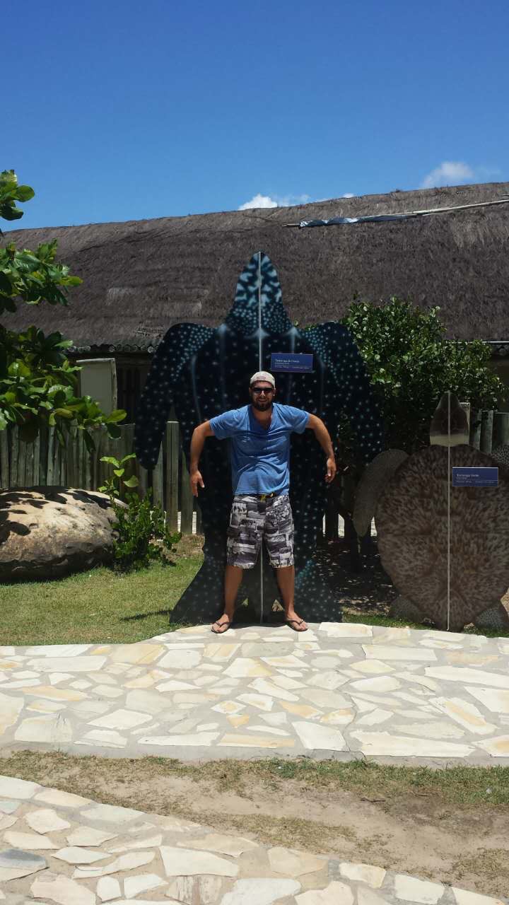 Back to our day: Upon arrival we checked into our hotel and then walked to the beach, about 15 minutes away. The beach was beautiful with rocky islands and hills in the background. The waves were gentle and we saw small sharks swimming near the beach. Some park workers brought sea turtles onto the beach and everyone else crowded around. The beach closed at 4:00 because the tide rises up to vegetation and there is no sand to sit on. We caught a bus to the center of town and ate burgers for a late lunch. We stopped by a grocery store and got some snacks and sandwich stuff. It was dark by the time we caught a bus back to our pousada and we watched tv and ate sandwiches before bed.