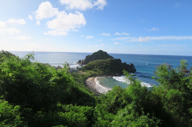 The next day we ate a big breakfast and then hiked back to the natural pool trail. It was a nice hike but when we saw the natural pool we weren’t very impressed. It was small and crowded and we think it’s necessary to make arrangements ahead of time to snorkel there. We decided not to mess with it and returned to the same spot where we had snorkeled the previous day. We only stayed for about an hour but the snorkeling was even better. We saw several sting rays, two 4 foot sharks, and seven sea turtles eating in a group. It was an awesome time but we had to return and check out of our hotel. We walked the short way back to the airport and took a taxi to our next pousada. We stayed in a bungalow here that was rustic but quite beautiful and even had an ocean view. The location was good and after a huge lunch we hiked to a few different beaches on the central northern side of the island. I did some more snorkeling but the waves were quite violent and there were rocks underwater. We hiked to the top of a rocky hill next to the ocean and took pictures of the sunset. We returned to our bungalow and bought some fruits and vegetables from a nearby supermarket. We ate these for dinner and watched a movie. We were exhausted and asleep quite early.