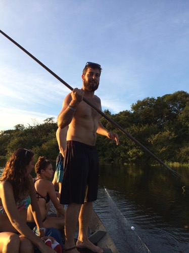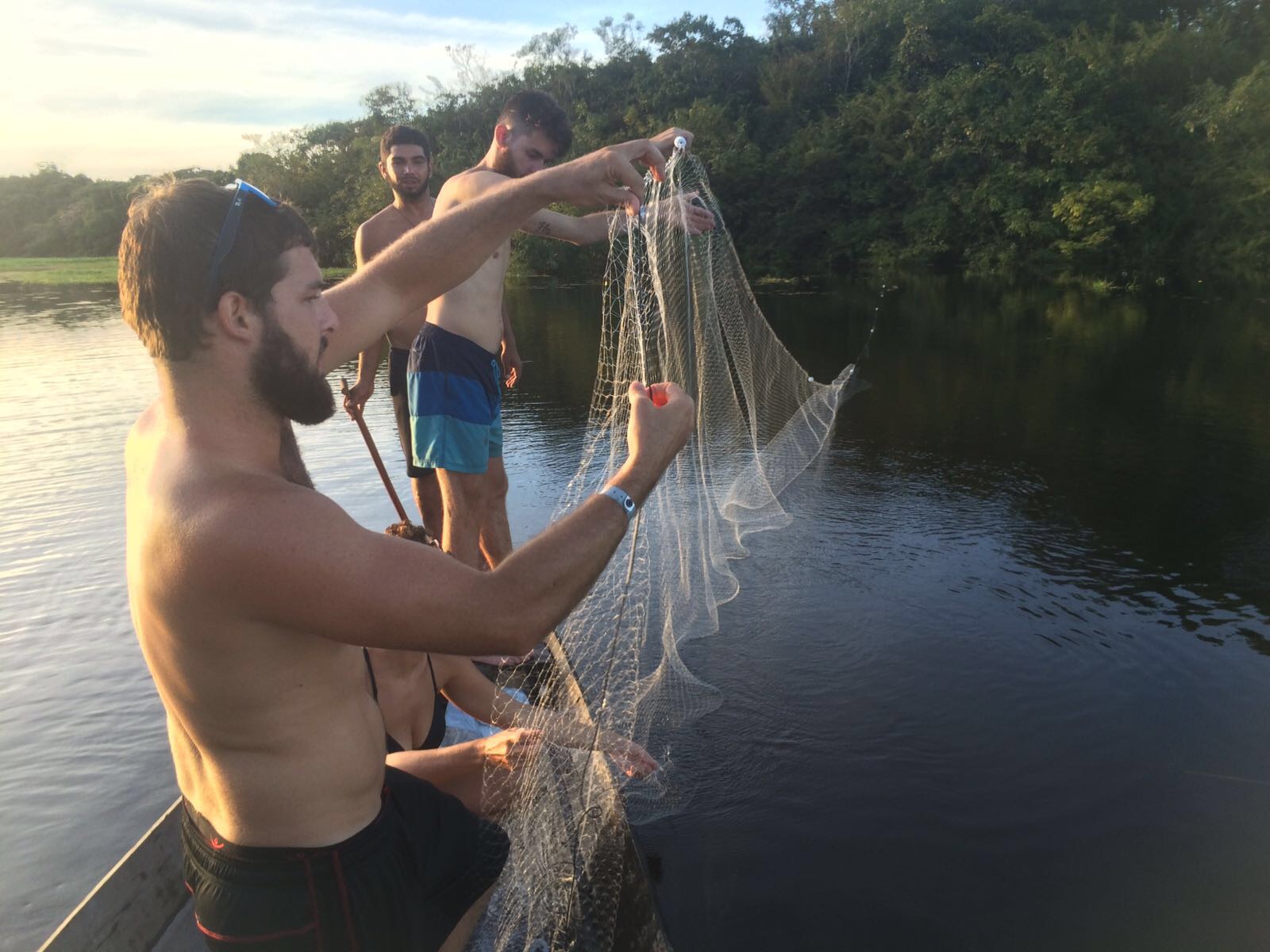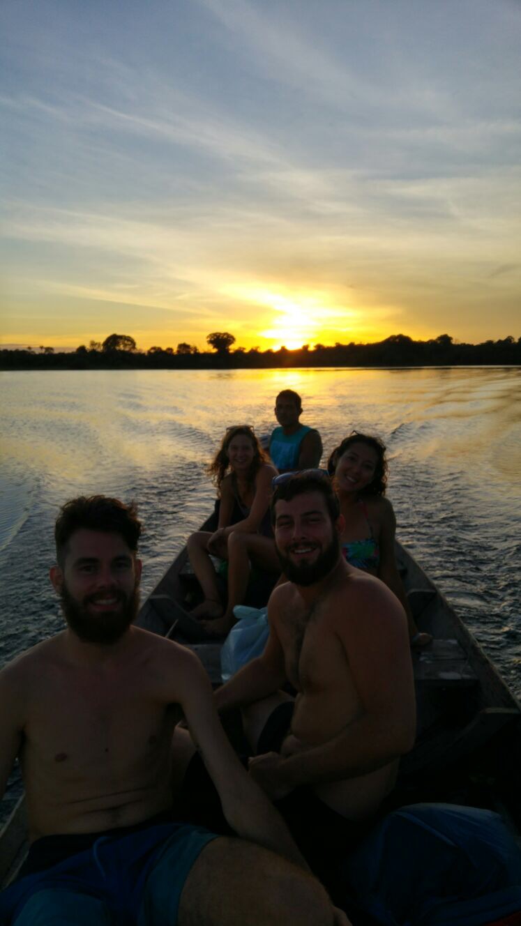 We all got up and had breakfast together then went to the agency. Our first stop was the Meeting of the Waters. It was even better than I thought it would be! Our guide, Eduardo, explained why the waters are separated. Turns out the Rio Negro has a higher acidity, is warmer, and it flows faster than the Solimoes. The contrast of the colors was striking. He made us put our hands in the water as we passed it and you could really tell the temperature change as well! After a few more hours of traveling, we get to our host home and have this amazing lunch and swam in the river. There was already another group with two French brothers, a girl from Sweden, and a girl from Germany there so we ended up hanging out with them until about 3 or 4 in the afternoon. We left then to go fishing for our dinner. After finding a good fishing spot, Eduardo taught us how to lay out the net to catch fish. One thing I absolutely loved about our group is that there were no lazy people. We all put in effort and really wanted to delve into the experience together. After setting up the net, we spent some time swimming in the river (sounds crazy right?) and we all watched a gorgeous sunset together. It was an unforgettable experience. Later, we checked the nets and ended up catching about 6 or 7 fish and a few piranhas. After taking the fish, Eduardo took us on a night tour of the river. We saw how to look for sleeping fish to spear, how to search for caimans with a headlamp, and how to catch them. He actually ended up getting into the water, caught a small caiman, and explained a few details of it. For example, they don’t have a tongue and their sides are the only parts used for leather. Also, if you catch their eyes glowing at night, you can tell what size a caiman is by the color of the reflection. Orange is a smaller one, red is a huge one. He put a string around the mouth and let us all hold it and take a picture and then he put it to sleep! He told us that he only catches smaller ones and showed us a scar around his wrist from a bigger caiman that bit him. We ended up visiting a small convenient store on the river and ate snacks before heading back to the house. It was a beautiful, starry boat ride back. Luckily dinner was already made because we were starving so we saved the fish for lunch the next day. After another delicious dinner, we all hung out and went to bed in some hammocks on the first floor of a house with no walls, just a roof.