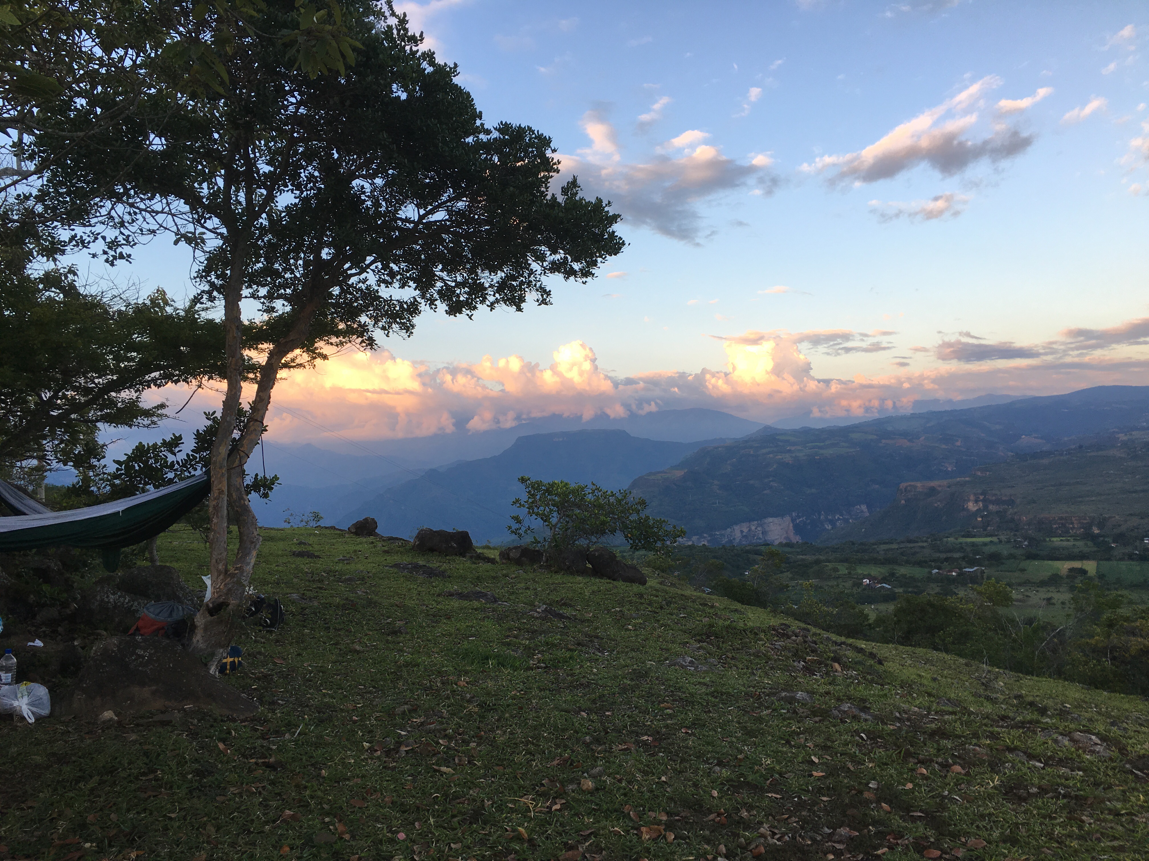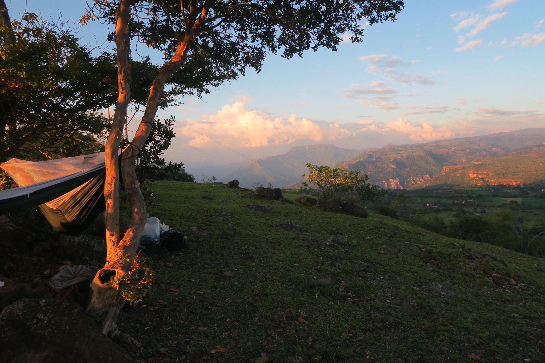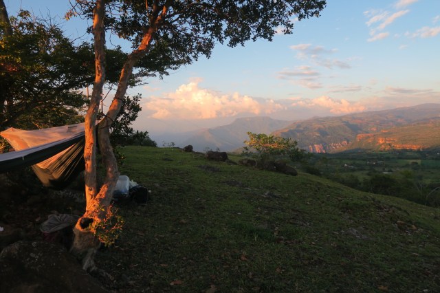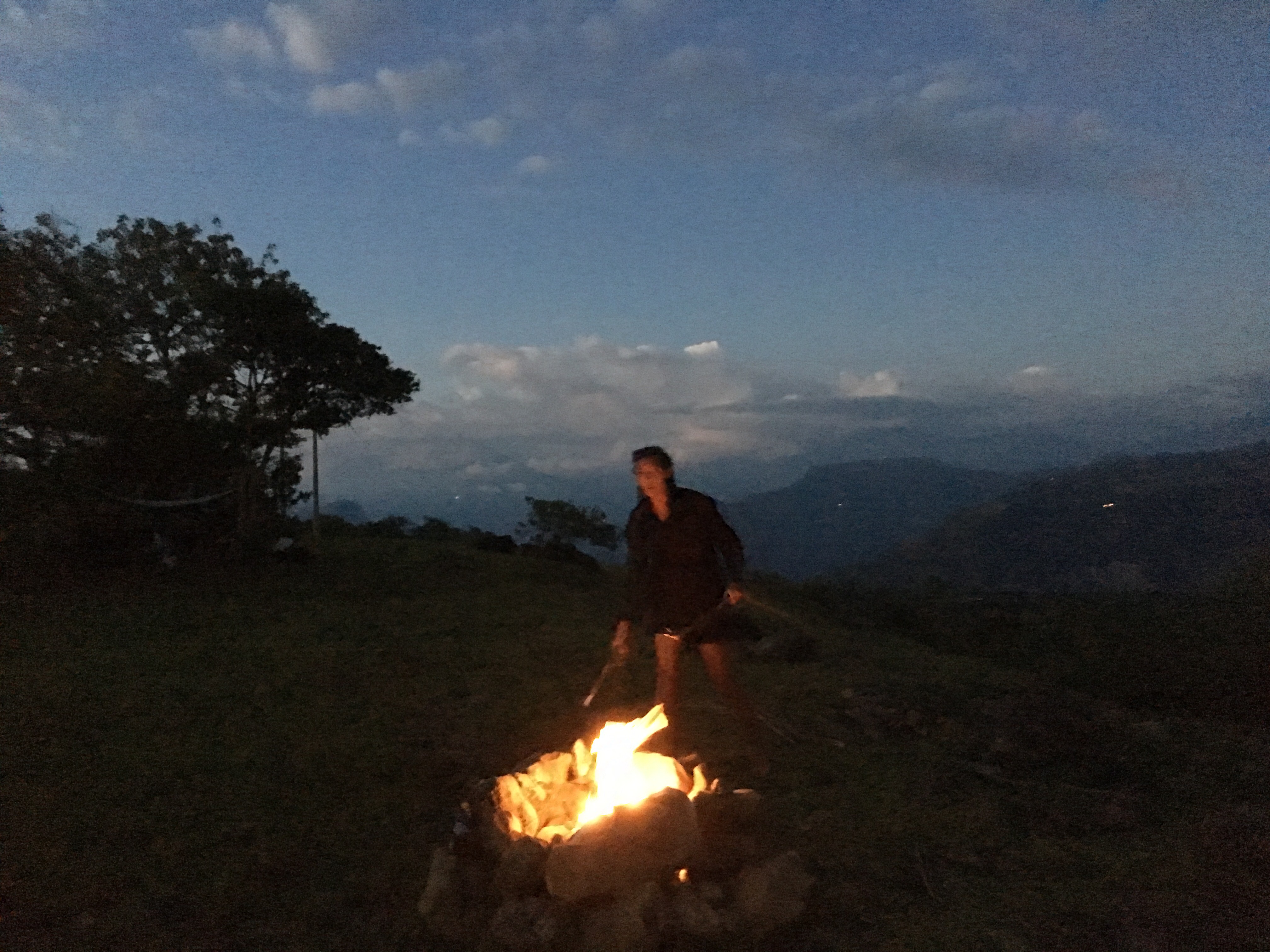The next morning we woke up and enjoyed breakfast in our campsite. We hiked onward to Villanueva, a slightly larger and more modern town. The morning hike was steep and hot, but we made it to town, relaxed, and ate lunch. We bought more supplies and then pressed onward. The next town was far away so we were looking for a campsite. Unfortunately, the road/path we walked on was lined with barbed wire fences protecting the farm. We saw few good options and almost settled for bad campsites when we finally found an amazing spot. On the ridge of a mountain there were a few trees, a firepit, no fences, and spectacular views from both sides. We loved this spot and enjoyed the sunset on both sides of the mountain. We made a nice dinner of little smokies, onions, peppers, and cheese, both skewered and cooked in aluminum foil. It was delicious again and we were soon asleep. It rained in the night but we quickly covered our hammocks with tarps/ponchos and stayed mostly dry.