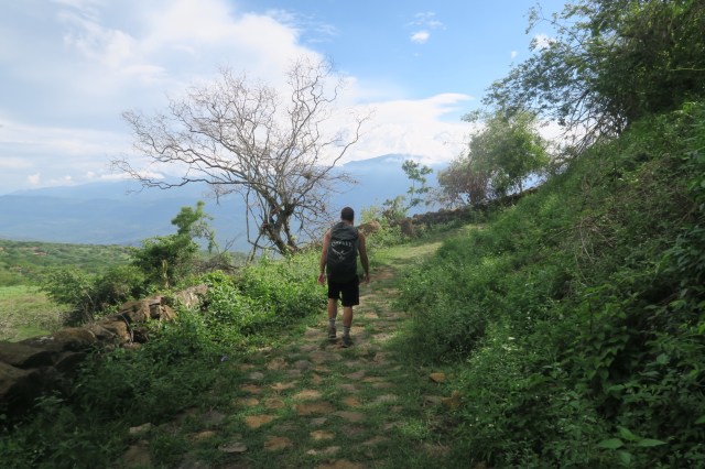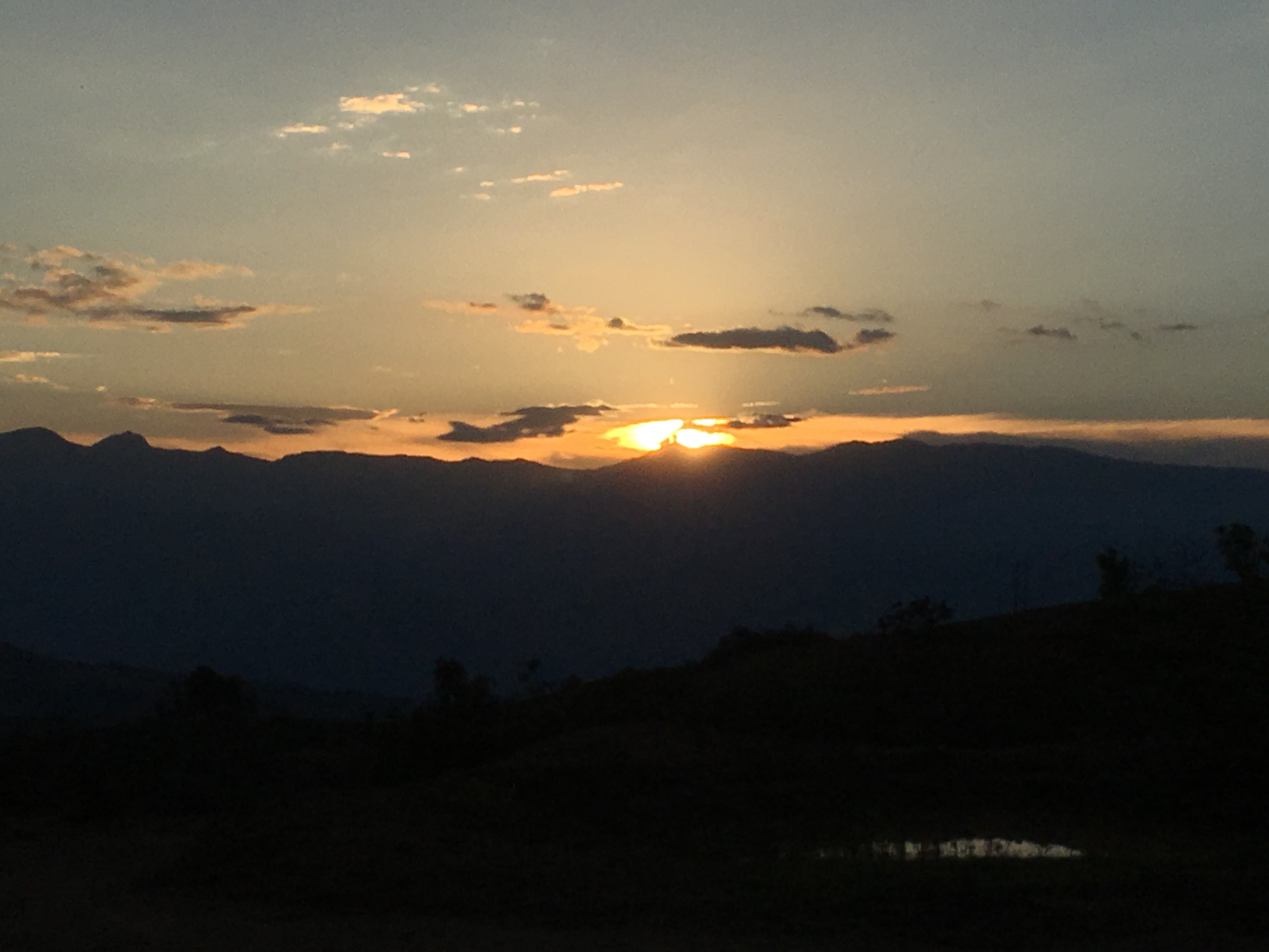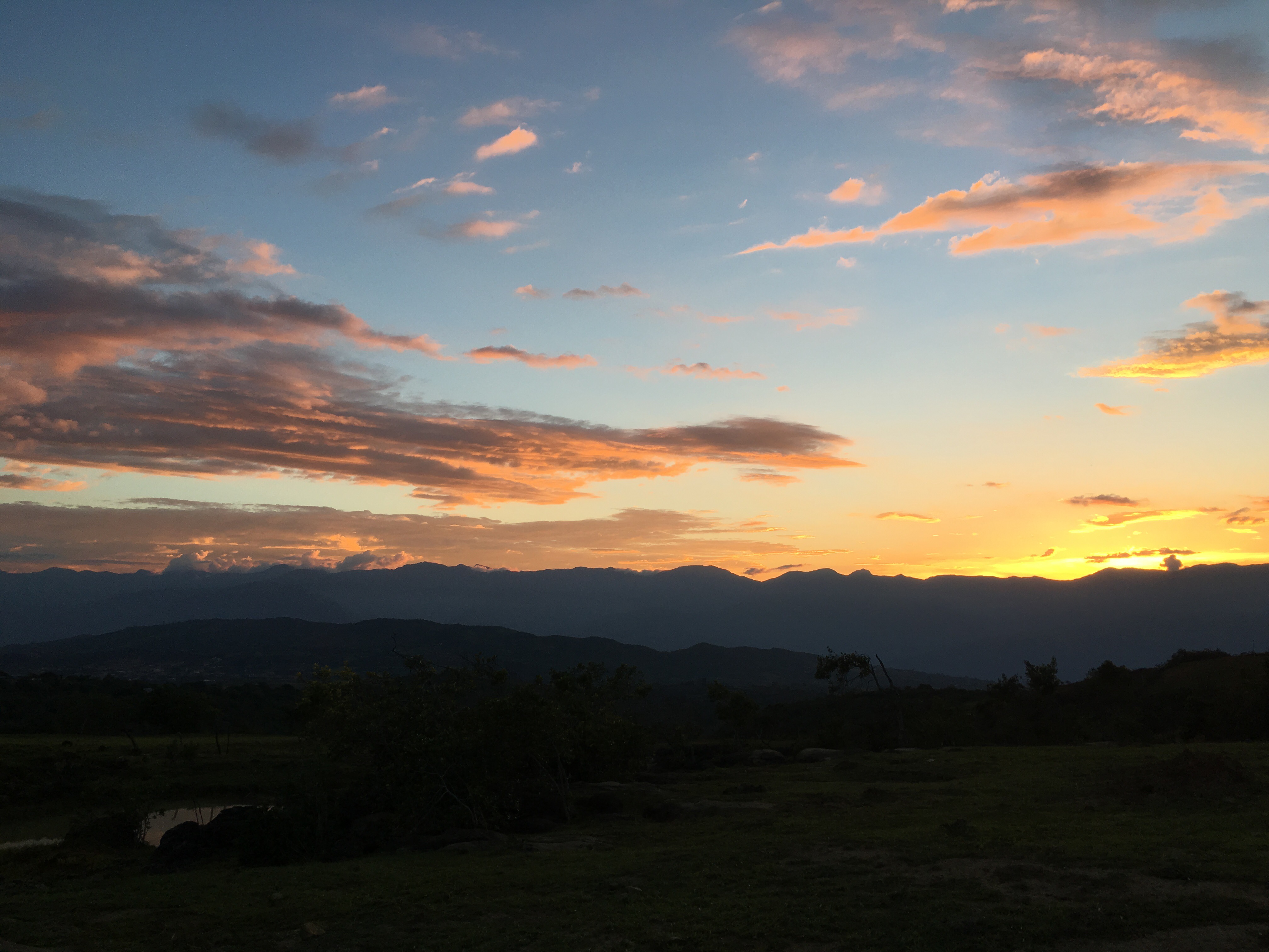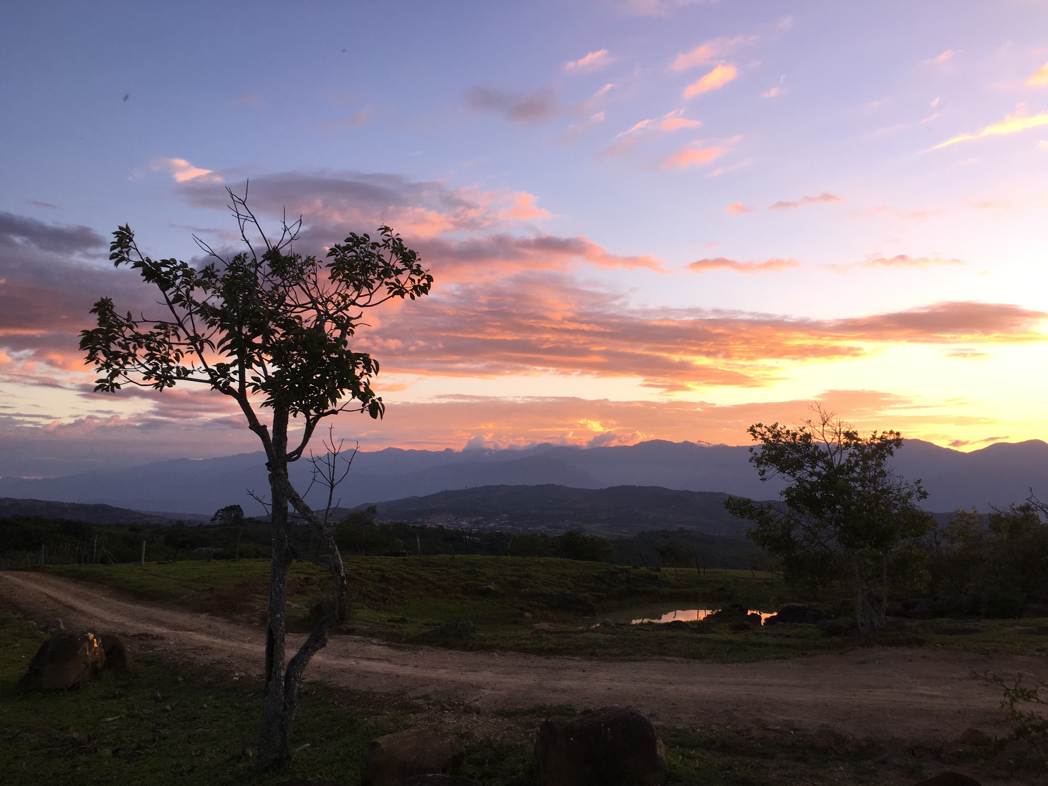 The next morning we woke up and enjoyed breakfast in our campsite. We hiked onward to Villanueva, a slightly larger and more modern town. The morning hike was steep and hot, but we made it to town, relaxed, and ate lunch. We bought more supplies and then pressed onward. The next town was far away so we were looking for a campsite. Unfortunately, the road/path we walked on was lined with barbed wire fences protecting the farm. We saw few good options and almost settled for bad campsites when we finally found an amazing spot. On the ridge of a mountain there were a few trees, a firepit, no fences, and spectacular views from both sides. We loved this spot and enjoyed the sunset on both sides of the mountain. We made a nice dinner of little smokies, onions, peppers, and cheese, both skewered and cooked in aluminum foil. It was delicious again and we were soon asleep. It rained in the night but we quickly covered our hammocks with tarps/ponchos and stayed mostly dry.
